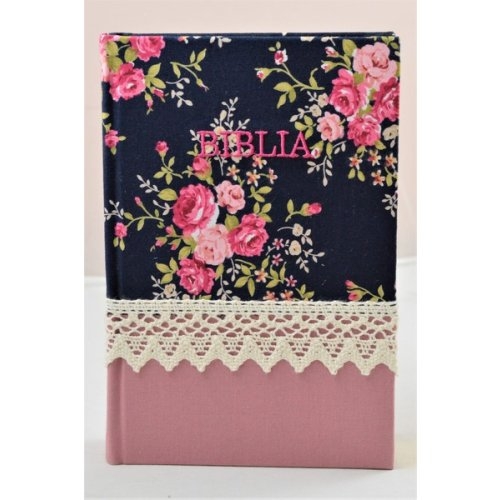 Biblia handmade, marime medie, coperta cartonata textila,roz cu motiv floral, margini aurii [SI 052 HM]