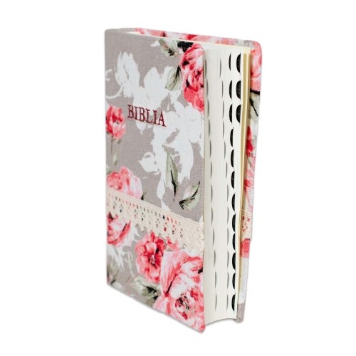 Biblia handmade, marime medie, coperta flexibila textila, cularea bej cu flori, margini albe ,index,harti biblice.