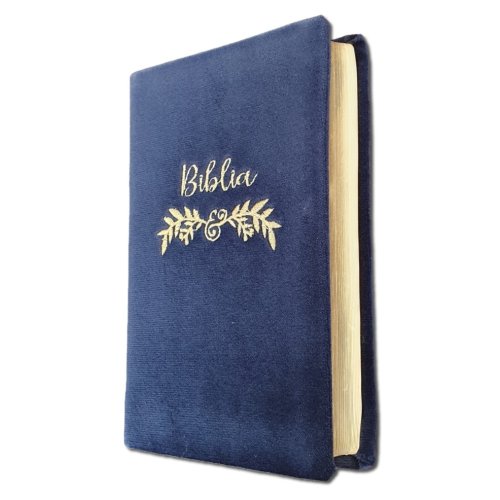 Biblia handmade, marime medie, coperta flexibila textila,culoare albastru inchis,margini aurii, cuv. lui Isus cu rosu [SB 052 HM]