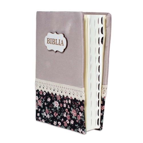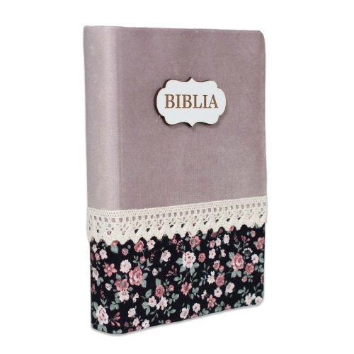 Biblia handmade, marime medie, coperta flexibila textila,culoarea mov deschis cu partea de jos florala,margini albe ,index,harti biblice.