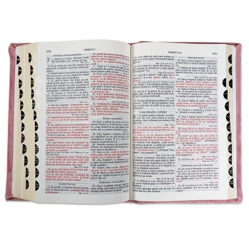 Biblia handmade, model 10, marime medie, coperta tare textila, margini aurii, index, cuv. lui Isus cu rosu [SI 057 HM]