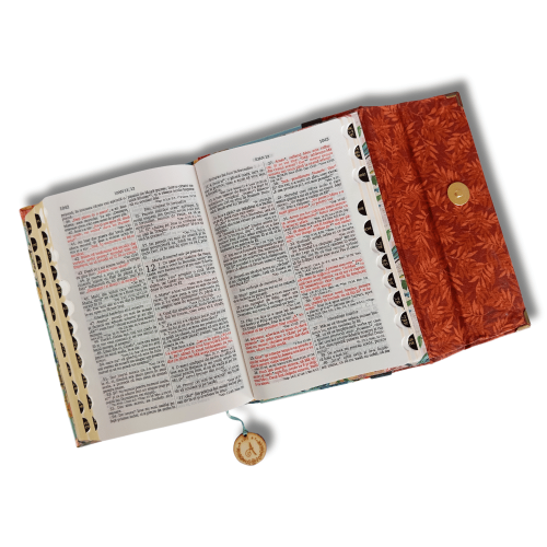 Biblia handmade, model 11, marime medie, inchidere cu clapeta, coperta tare textila, margini aurii, index, cuv. lui Isus cu rosu [SI 057 HM]