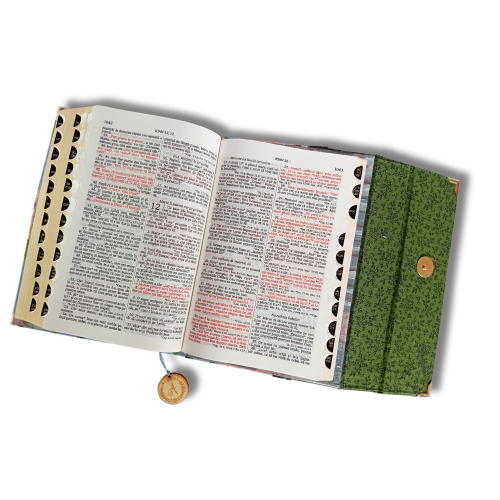 Biblia handmade, model 12, marime medie, inchidere cu clapeta, coperta tare textila, margini aurii, index, cuv. lui Isus cu rosu [SI 057 HM]