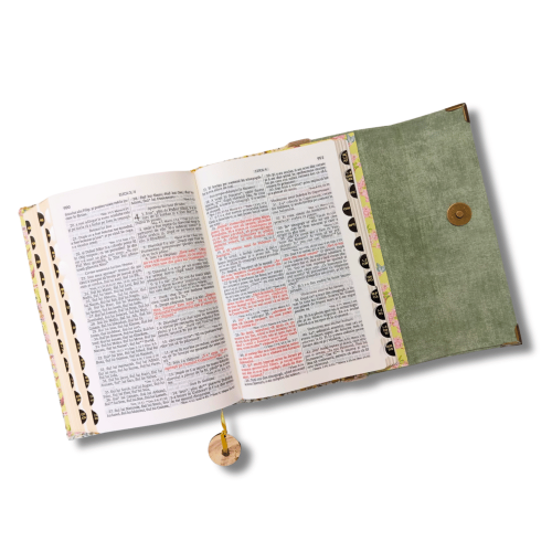 Biblia handmade, model 13, marime medie, inchidere cu clapeta, coperta tare textila, margini aurii, index, cuv. lui Isus cu rosu [SI 057 HM]