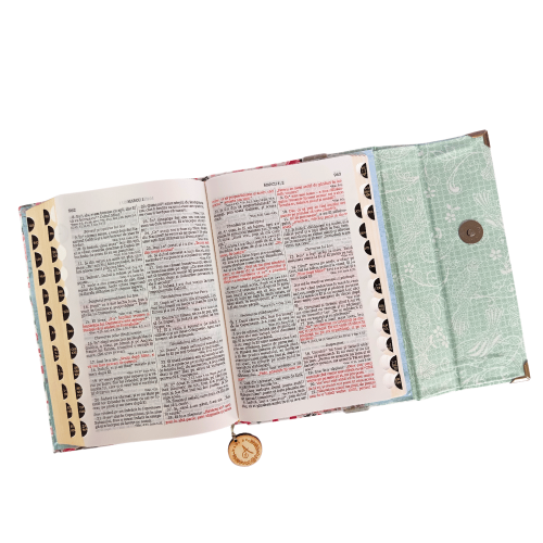 Biblia handmade, model 4, marime medie, inchidere cu clapeta, coperta tare textila, margini aurii, index, cuv. lui Isus cu rosu [SI 057 HM]