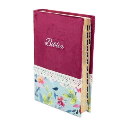 Biblia handmade, model 55, marime medie, coperta tare textila, margini aurii, index, cuv. lui Isus cu rosu [SI 057 HM]