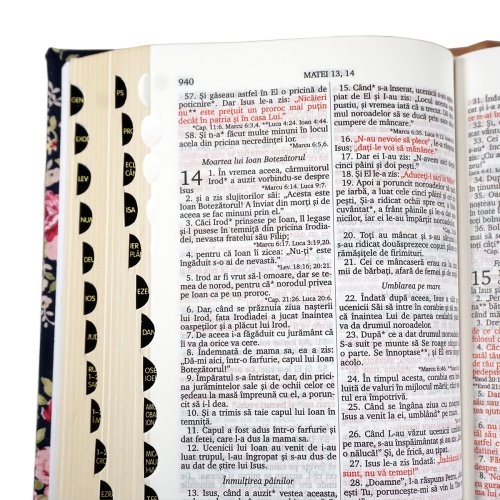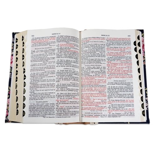 Biblia handmade, model 7, marime medie, coperta tare textila, margini aurii, index, cuv. lui Isus cu rosu [SI 057 HM]