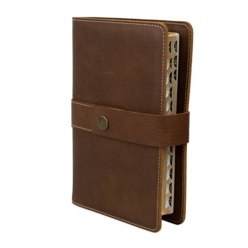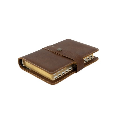 Biblia in husa handmade piele autentica, cu bareta lunga si capsa, marime medie, maro închis, index, margini aurii, cuv. lui Isus cu rosu [057 HBL]