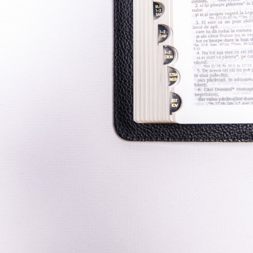 Această Biblie se remarcă și prin marginile aurii și indexul pe margine. Marginile aurii adaugă un aspect nobil și rafinat, iar indexul pe margine facilitează navigarea rapidă prin pagini și identificarea ușoară a pasajelor cheie.