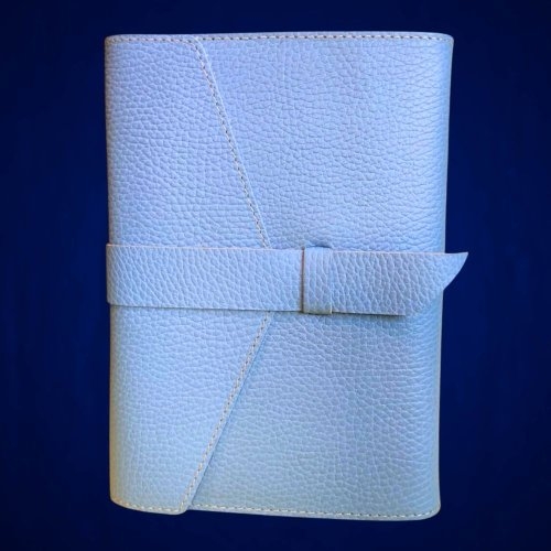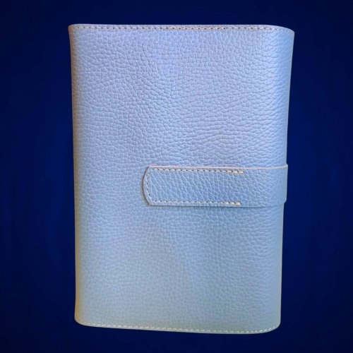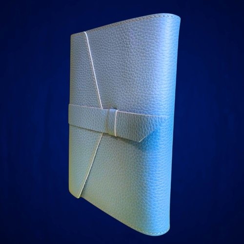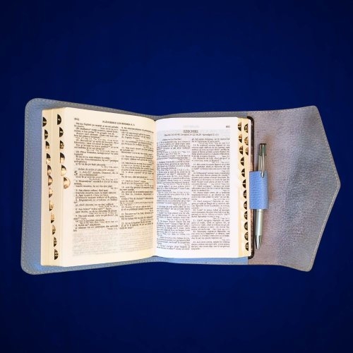Biblia in husa handmade piele autentica, cu bareta, marime medie, bleu ciel, index, margini aurii, cuv. lui Isus cu rosu [057 HCB]