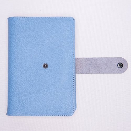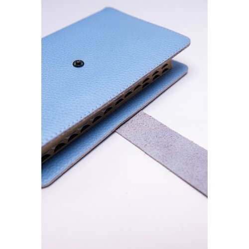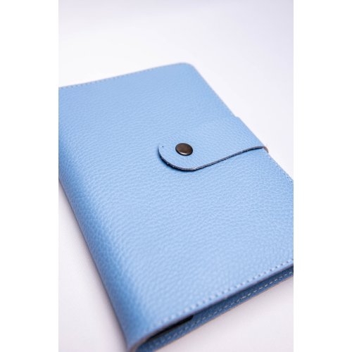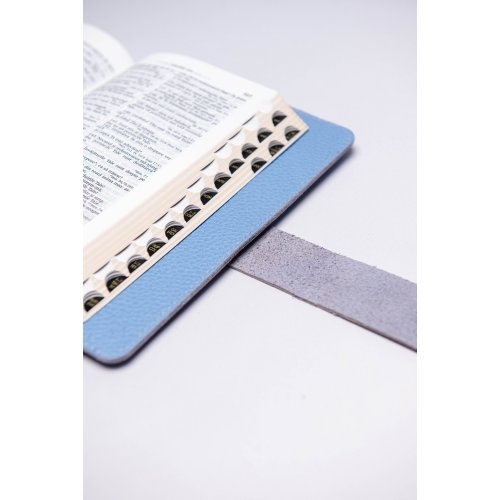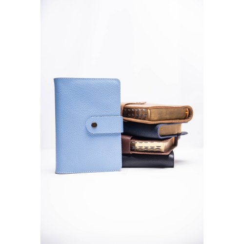 Biblia in husa handmade piele autentica, cu bareta si capsa, marime medie, bleu ciel, index, margini aurii, cuv. lui Isus cu rosu [057 HBS]