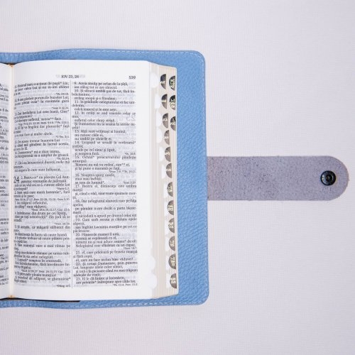 Inchiderea cu bareta și capsă adaugă o notă de eleganță și siguranță acestei Biblii. Bareața asigură protejarea paginilor și menținerea lor în siguranță, în timp ce capsa oferă o închidere precisă și comodă.