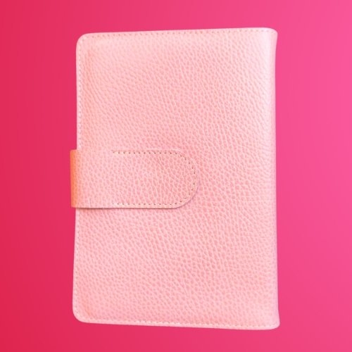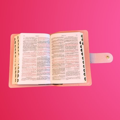 Biblia in husa handmade piele autentica, cu bareta si capsa, marime medie, roz pal, index, margini aurii, cuv. lui Isus cu rosu [057 HBS]