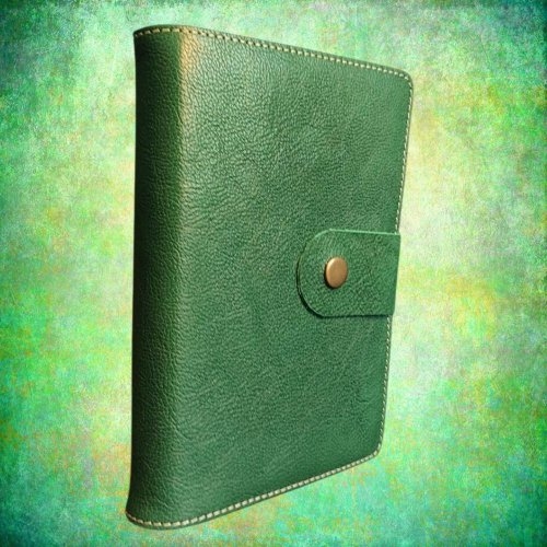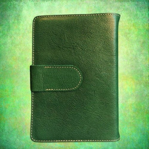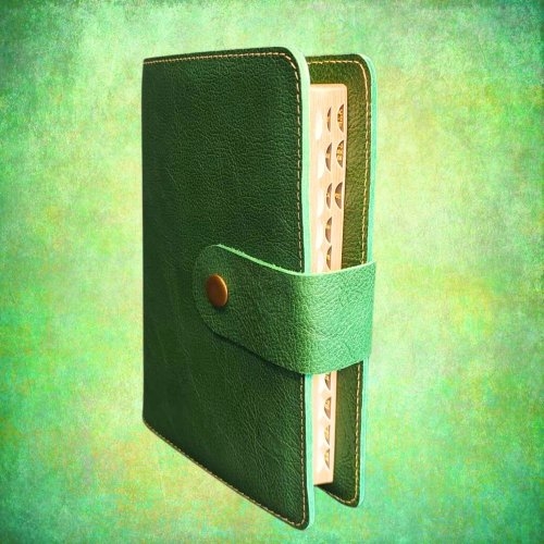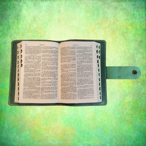 Biblia in husa handmade piele autentica, cu bareta si capsa, marime medie, verde, index, margini aurii, cuv. lui Isus cu rosu [057 HBS]