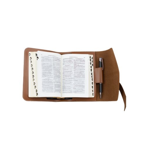 Biblia in husa handmade piele autentica, cu clapeta si bareta, marime mica, maro, index, margini aurii, cuv. lui Isus cu rosu [047 HCB]