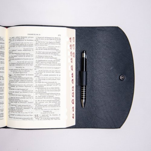 Inchiderea cu clapeta și capsă adaugă o notă de eleganță și siguranță acestei Biblii. Clapeta asigură protejarea paginilor și menținerea lor în siguranță, în timp ce capsa oferă o închidere precisă și comodă.
