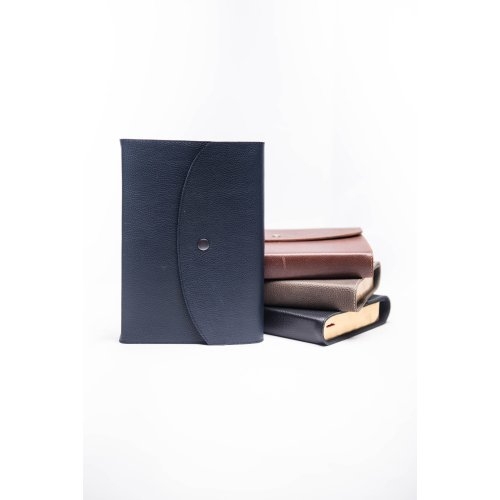 Biblia in husa handmade piele autentica, cu clapetă si capsă, mărime medie, bleumarin, index, margini aurii, cuv. lui Isus cu rosu [057 CLA]