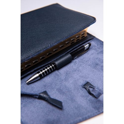 Biblia in husa handmade piele autentica, cu clapeta si snur, marime medie, bleumarin, index, margini aurii, cuv. lui Isus cu rosu [057 SNU]