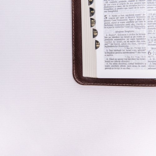 Inchiderea cu clapeta si snur confera acestei Biblii un element elegant si practic. Clapeta se deschide si se inchide cu usurinta, pastrand paginile protejate si sigure, in timp ce snurul asigura o fixare suplimentara, prevenind deschiderea accidentală.