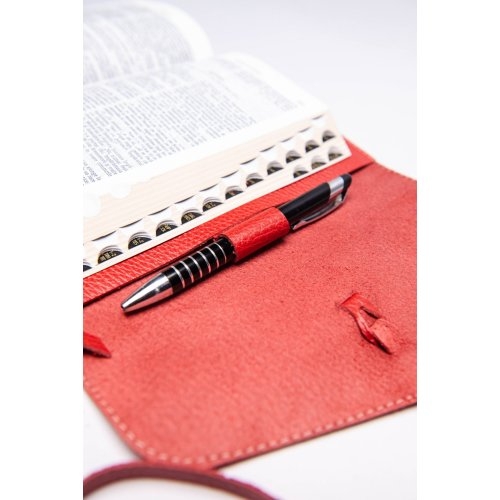 Biblia in husa handmade piele autentica, cu clapeta si snur, marime medie, rosie, index, margini aurii, cuv. lui Isus cu rosu [057 SNU]