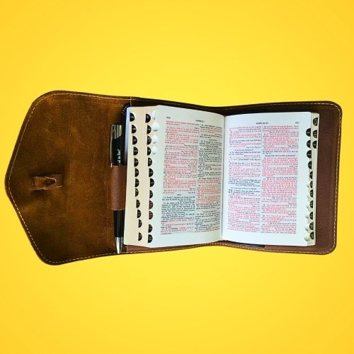 Biblia in husa handmade piele autentica, cu clapeta si snur, marime mica, maro inchis, index, margini aurii, cuv. lui Isus cu rosu [047 HCS]