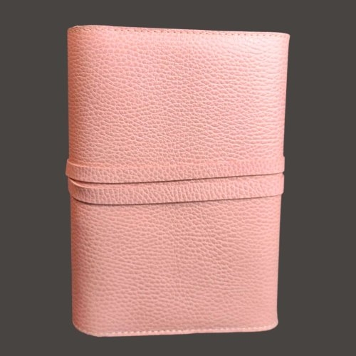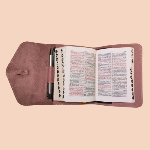 Biblia in husa handmade piele autentica, cu clapeta si snur, marime mica, roz pal, index, margini aurii, cuv. lui Isus cu rosu [047 HCS]