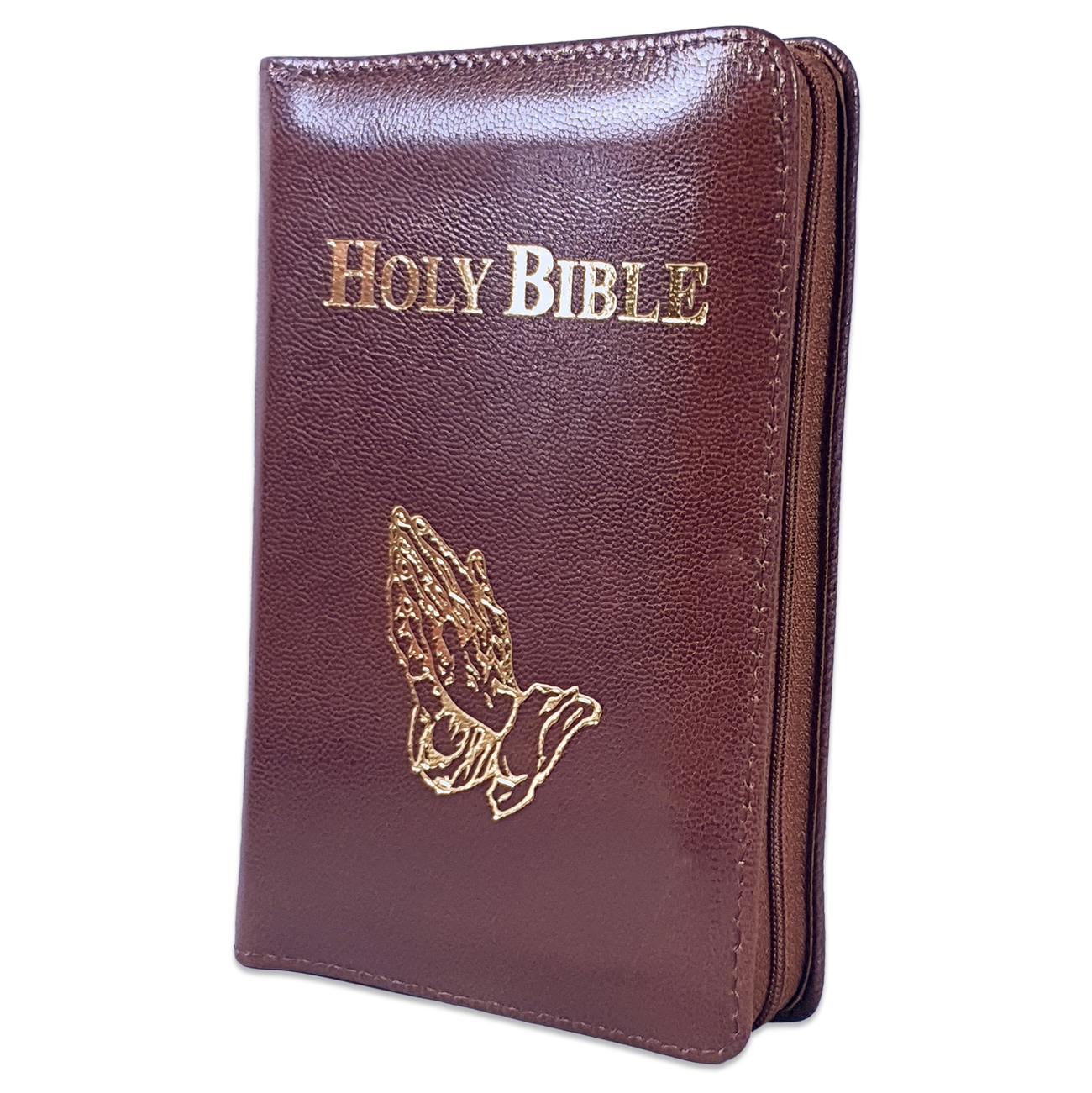 Biblia in lb. engleza, King James Version, mica, piele, maro, aurita, fermoar, cuv. lui Isus cu rosu, simbol maini in rugaciune