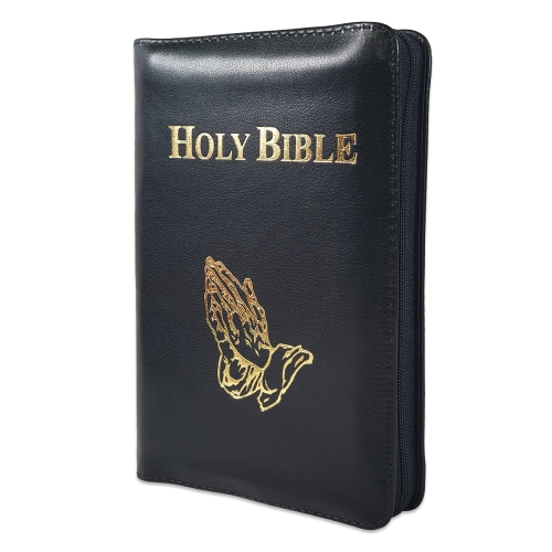 Biblia in lb. engleza, King James Version, mica, piele neagra, aurita, fermoar, cuv. lui Isus cu rosu, simbol maini in rugaciune