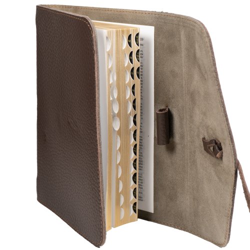 Biblia in piele autentica, cu clapeta si snur, marime medie, maro închis, index, margini aurii, cuv. lui Isus cu rosu [057 SNU]