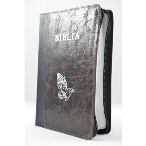 Biblia mare, coperta din piele, negru | brun, fermoar, margini argintii, cu maini, cuv. lui Isus in rosu [073 PFR]