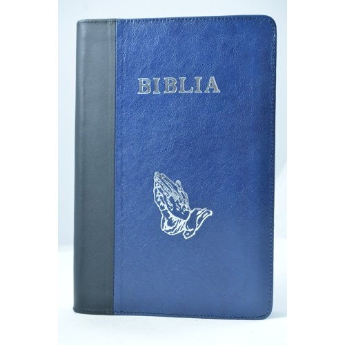 Biblia mare, coperta din piele, negru | indigo, fermoar, margini argintii, simbol - maini in ruga, cuv. lui Isus in rosu [073 PFR]