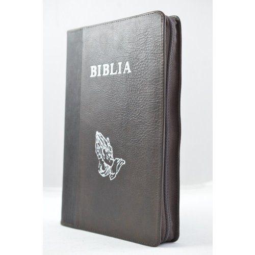 Biblia mare, coperta din piele, nuante inchise, fermoar, margini argintii, simbol - maini in ruga, cuv. lui Isus in rosu [073 PFR]
