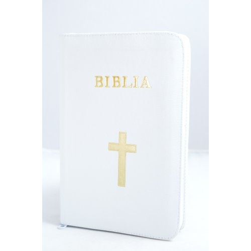 Biblia mare, coperta piele, alba, fermoar, simbol cruce [VS 073 PF]