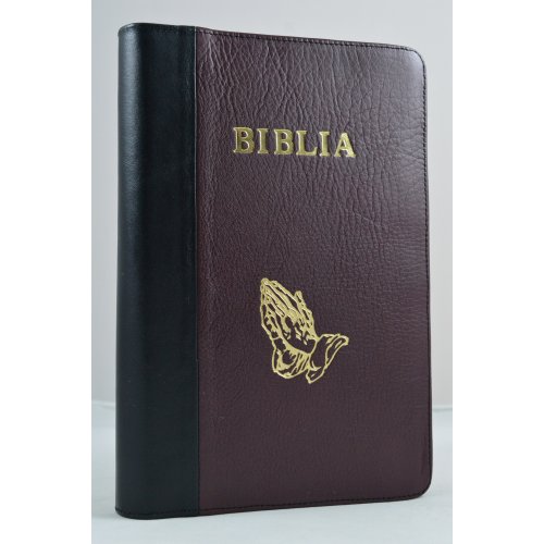 Biblia mare, coperta piele, culoare negru cu visiniu, fermoar, simbol maini [VS 073 PF]