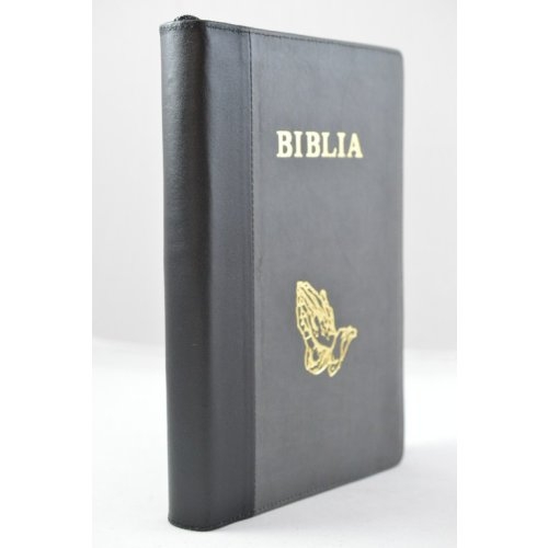 Biblia mare, coperta piele, culoare negru | gri, fermoar, margini aurie, simbol - maini in ruga, cuv. lui Isus in rosu [073 PFR]