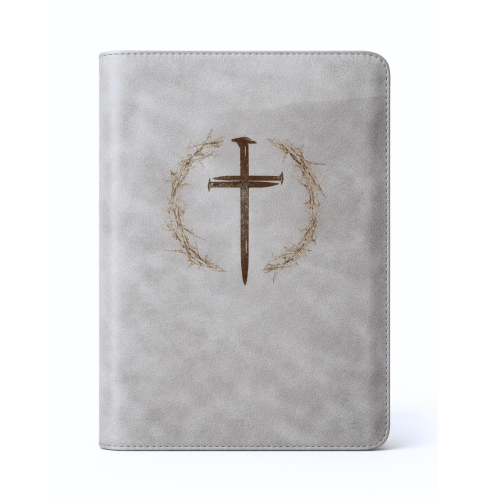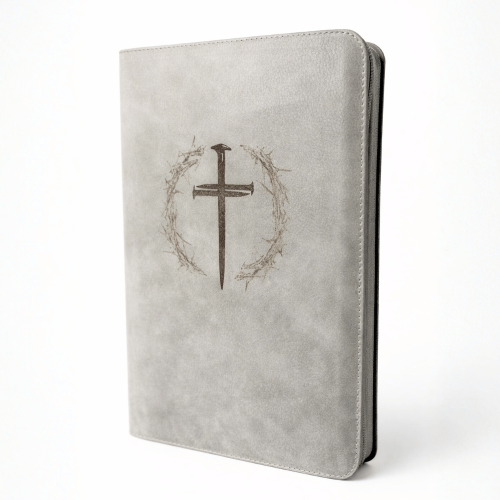 Biblia mare, coperta piele, gri, fermoar, index, aurita, cruce gravată, cuv. lui Isus cu rosu [073 PFI]