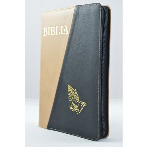Biblia mare, din piele, bej / negru, fermoar, margini aurii, simbol - maini in ruga, cuv. lui Isus in rosu [073 PFR]
