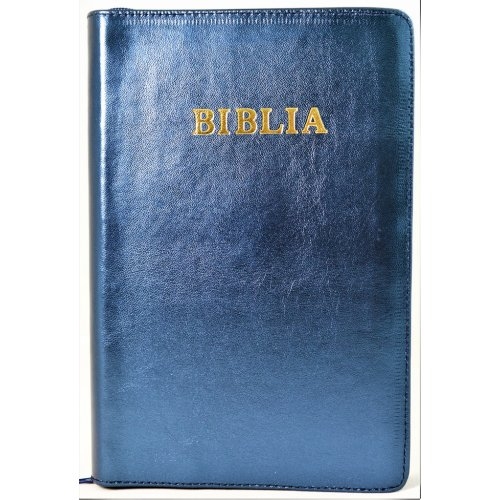 Biblia mare, din piele, culoare bleumarin sidefat, fermoar, margini aurii, simbol - simpla, cuv. lui Isus in rosu [ SB 073 PFR]