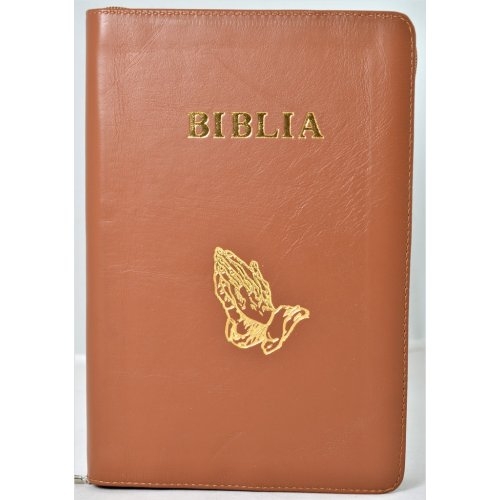 Biblia mare, din piele, culoare maro, fermoar, margini aurii, simbol - maini in ruga, cuv. lui Isus in rosu [ SB 073 PFR]