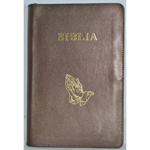 Biblia mare, din piele, culoare maro sidefat, fermoar, margini aurii, simbol - maini in ruga, cuv. lui Isus in rosu [ SB 073 PFR]