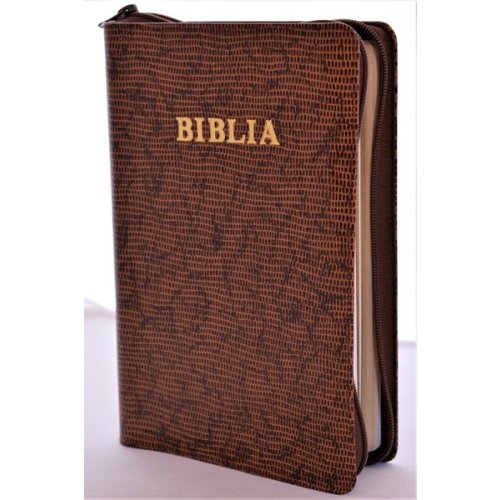 Biblia mare, din piele, culoare maro texturat, fermoar, margini aurii, simbol - simpla, cuv. lui Isus in rosu [ SB 073 PFR]