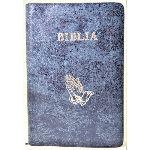 Biblia mare, din piele, nuanta bleumarin, fermoar, margini argintii, simbol - maini in ruga, cuv. lui Isus in rosu [073 PFR]