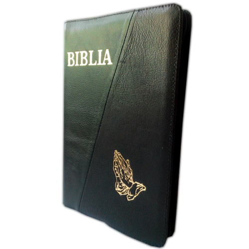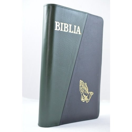 Biblia mare, coperta piele, verde inchis / negru, fermoar, margini aurii, simbol - maini, cuv. lui Isus in rosu [073 PFR]