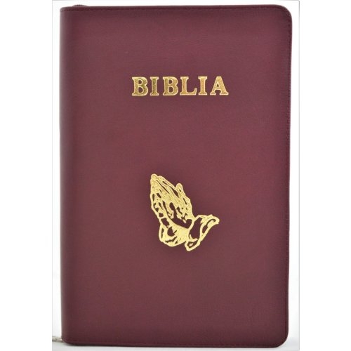 Biblia mare, din piele, visinie, fermoar, margini aurii, cu maini, cuv. lui Isus in rosu [073 PFR]