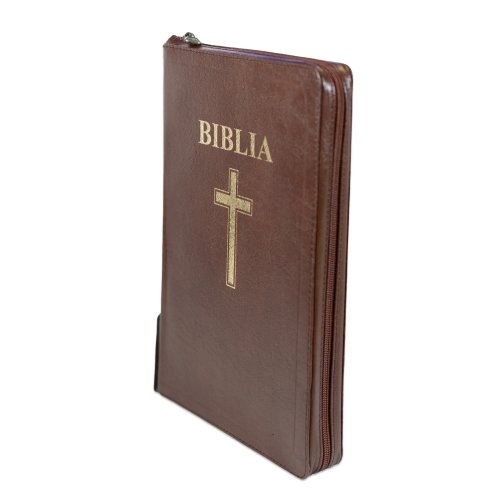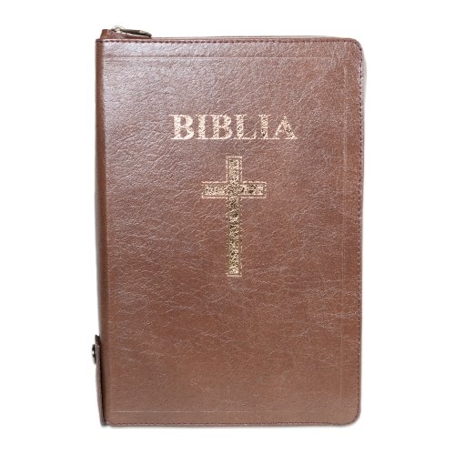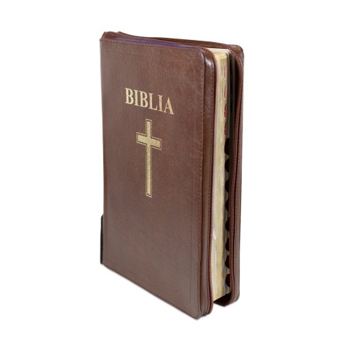 Biblia mărime mare, piele, maro, margini aurii, index, fermoar cu capsă, hărți biblice, simbol cruce, cuv. lui Isus cu roșu [077 ZTI FIB]