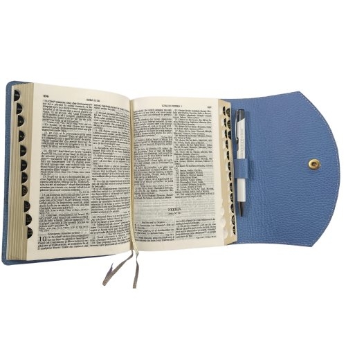 Biblia marime medie, bleu ciel, piele, inchidere clapeta cu capsa 2, margini aurii, index, cuv. lui Isus cu rosu [MAR 057 PCI]