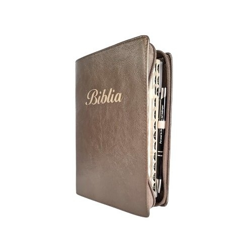 Biblia marime medie, bronz, piele, fermoar, margini aurii, index, cuv. lui Isus cu rosu [MAR 057 PFI]
