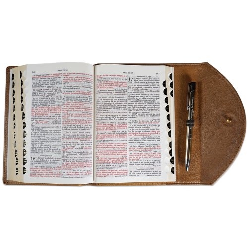 Biblia marime medie, crem, piele, inchidere clapeta cu capsa 1, margini aurii, index, cuv. lui Isus cu rosu [MAR 057 PCI]