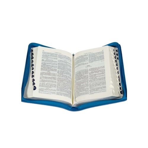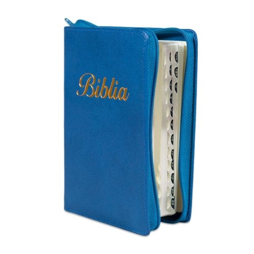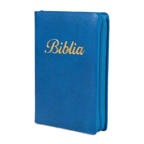 Biblia marime mica, culoare albastra, piele, fermoar, margini argintii, index, cuv. lui Isus cu rosu [047 PFI]