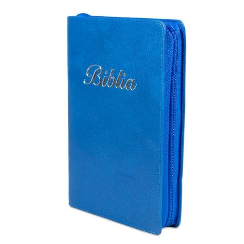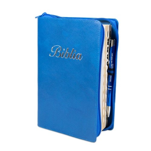 Biblia marime medie, culoare albastra, piele, fermoar, margini aurii, index, cuv. lui Isus cu rosu [MAR 057 PFI]